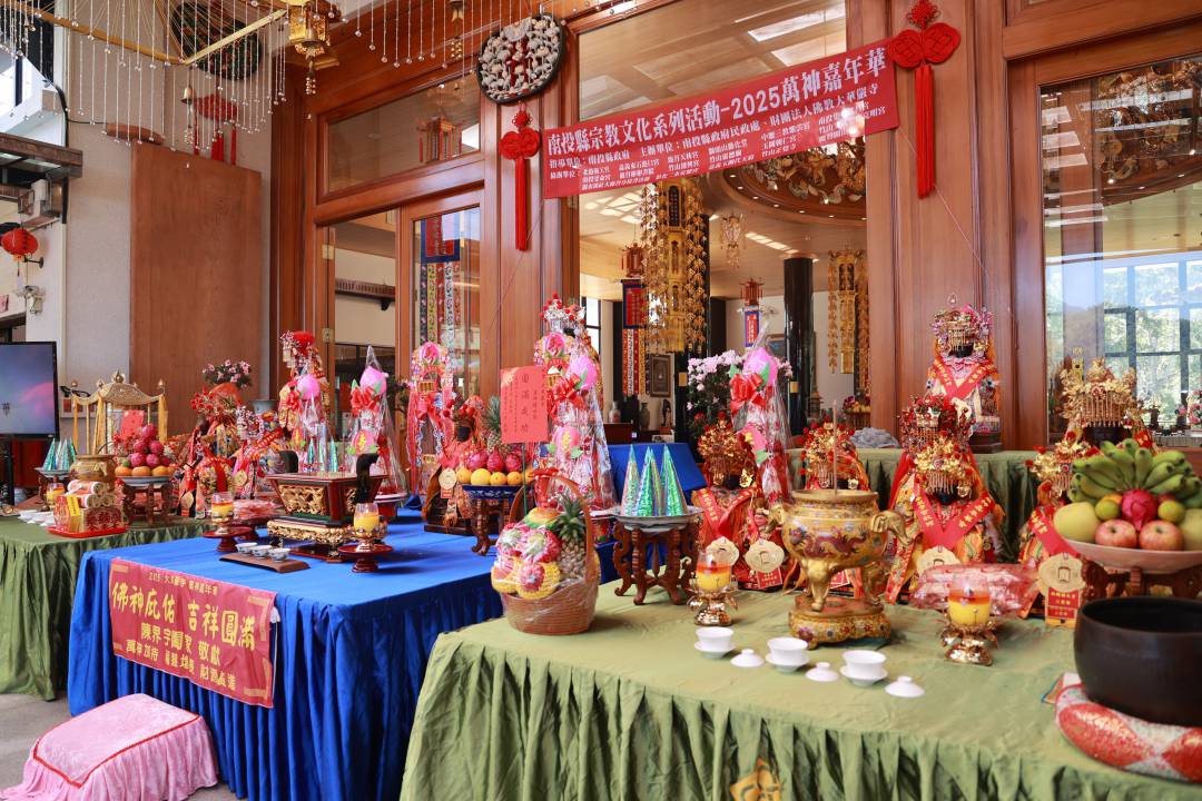 許縣長表示,大華嚴寺是鹿谷重要宗教信仰中心,舉辦多屆的萬神嘉年華,邀請各宮廟神尊齊聚一堂,讓信眾感受諸佛菩薩、萬神的庇佑及加持。相關活動不僅是信仰盛典,也讓南投宗教文化匯流,為地方觀光與產業注入新活力,活動還包括書法暨文物展,展現藝術之美,宗教雖異,追尋的真理卻同出一源。今年華嚴萬神嘉年華有三大特色,一是邀集北港朝天宮媽祖、嘉義笨港港口宮媽祖…等台灣各地宮廟的眾位神尊齊聚一堂,信眾不必辛勞奔波,即可一次獲得眾多神明庇佑與加持。