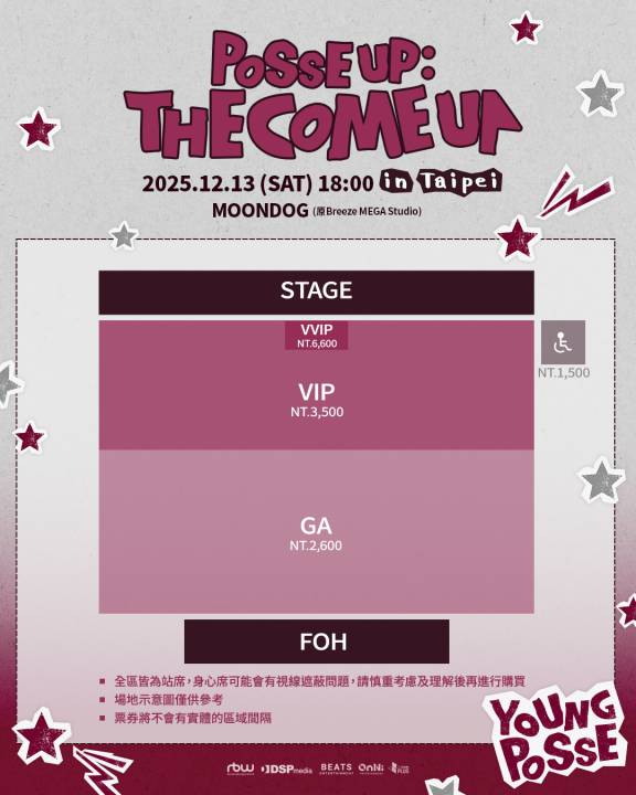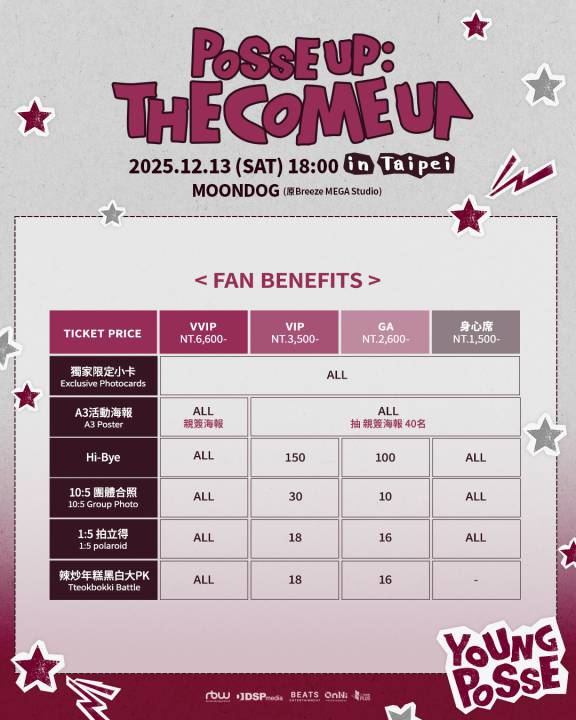 「2025 YOUNG POSSE [POSSE UP : THE COME UP in Taipei]」即將於12月13日(六)18點於MOONDOG舉行,票價訂為:VVIP區NT$6,600元、VIP區NT$3,500元、GA區NT$2,600元、身心席NT$1,500元,售票時間訂10月25日(六)12點於Ticket Plus遠大售票網站啟售。本次活動福利誠意滿滿,包含「10:5團體合照(共50名)、獨家限定小卡、A3活動海報(隨機抽親簽海報共40名)、HI-BYE」。超重視粉絲的 YOUNG POSSE更是加碼祭出韓國女團史無前例、最強福利企劃「辣炒年糕黑白大PK」!全區TELEPOSSE皆可加碼抽,幸運粉絲將分組動手煮辣炒年糕,並由YOUNG POSSE 親自評分,吃完辣炒年糕還能跟YOUNG POSSE「一對五」拍立得合照,誓言讓粉絲「有吃有玩有得拿」,不只能與K-POP新星女團互動,還能享受一起料理韓國國民美食的快樂,共度最有趣又親密的午餐時光。